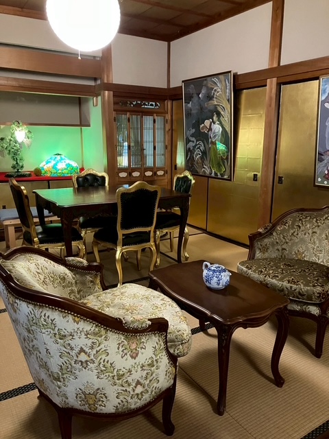壁に並ぶ作品を眺めながら、素朴でやさしいランチや喫茶を楽しめる大正から昭和初期を思わせる室内で、そっとアートが寄り添う場所。癒しと静寂のカフェスペースも新たに加わり心を整えられる空間に。